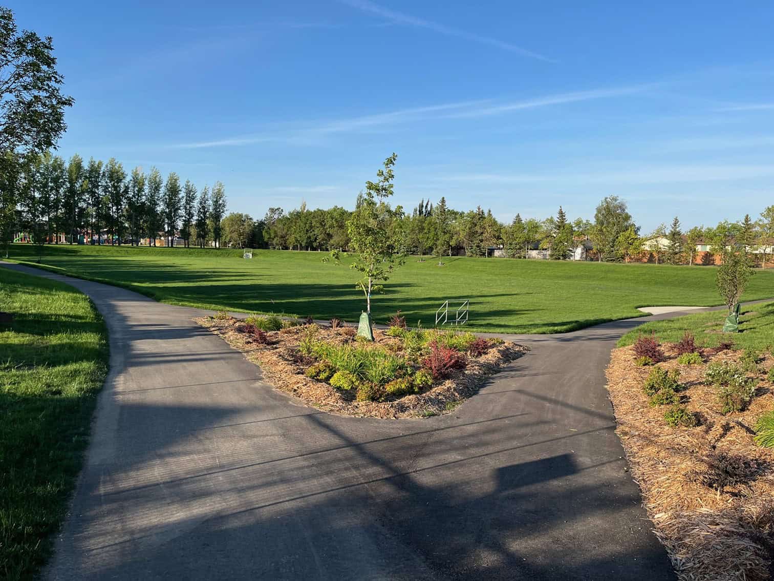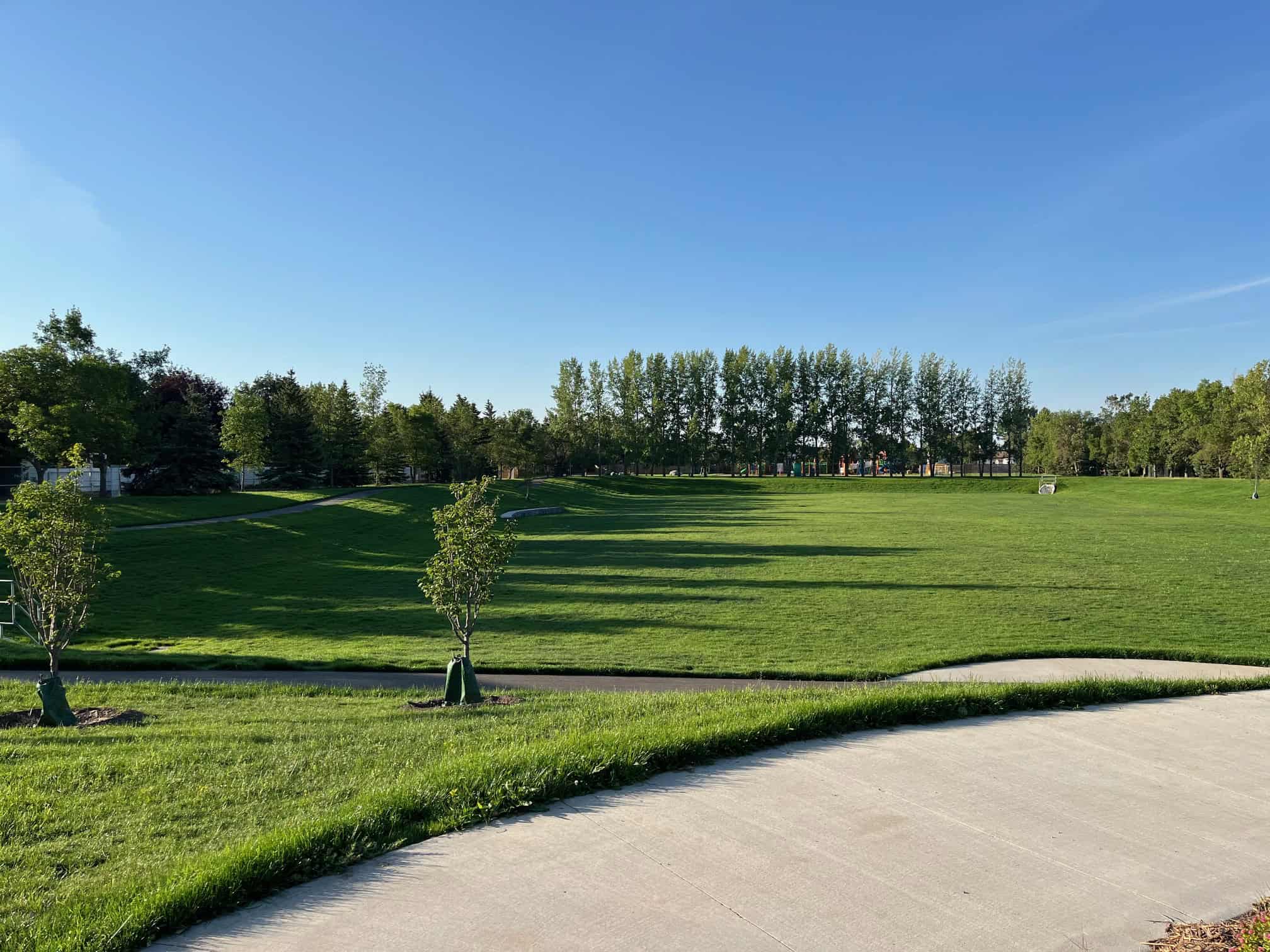 The large field portion of the park will remain closed until the fall of 2024 to allow for the grass to establish. The field will be irrigated throughout 2024 until the time it is opened back up for public use.