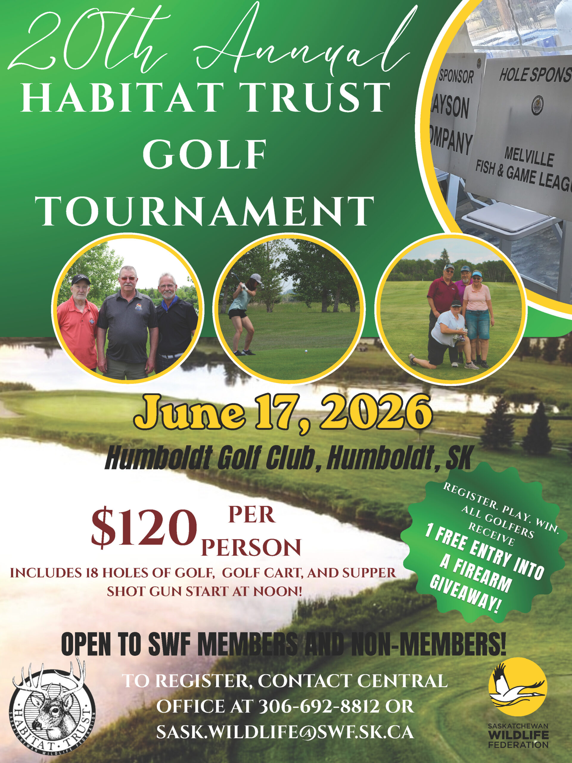 18 holes of golf, golf cart, and supper for $120/person. Shotgun start at noon. To register, contact Central Office at 306-692-8812 or sask.wildlife@swf.sk.ca