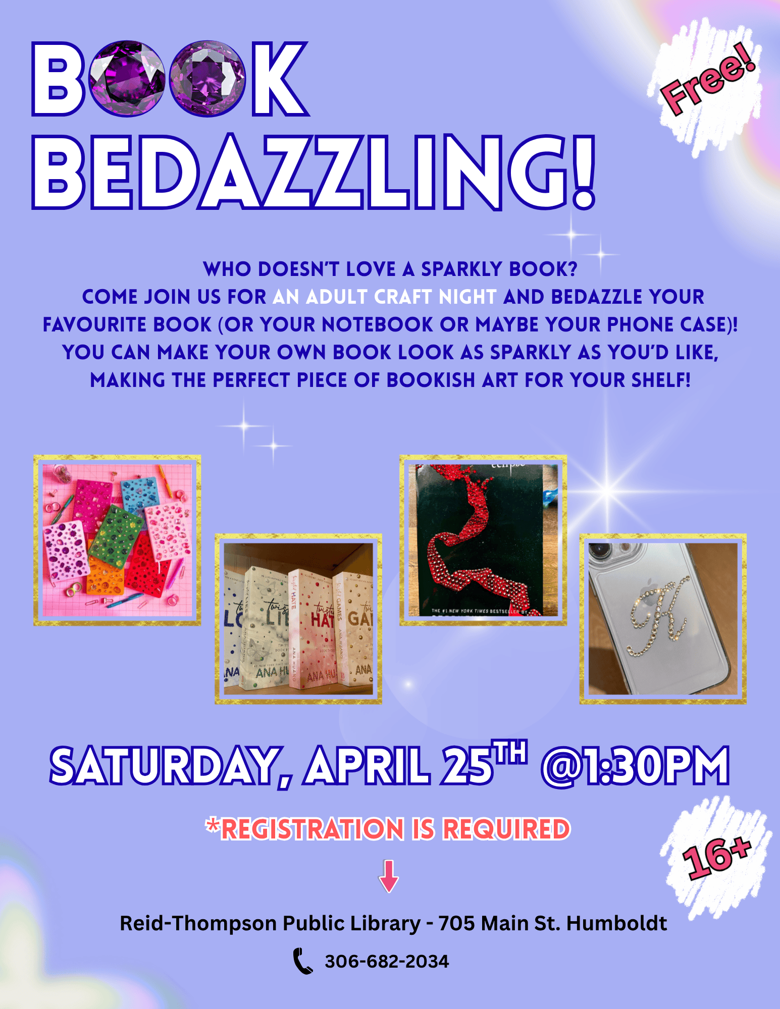 Ages 16 and up are invited to call or visit the library to register for their free Book Bedazzling craft! All supplies will be provided by the library free of charge, all you need is some creativity and a book/item to bedazzle!