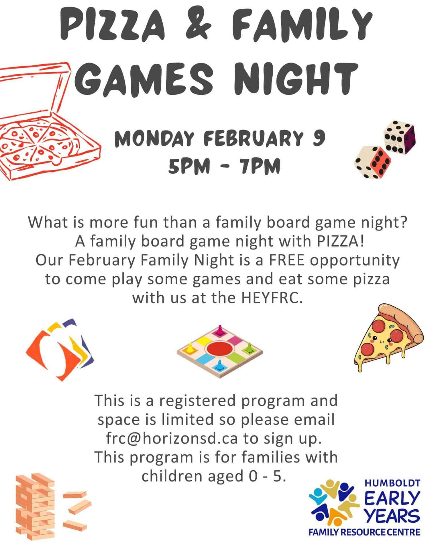 We will supply the meal and the games, you bring your family for this time for bonding and enjoyment. HEYFRC programs are for children aged 0-5 and their families and FREE. This program has limited space so you must preregister by emailing frc@horizonsd.ca.