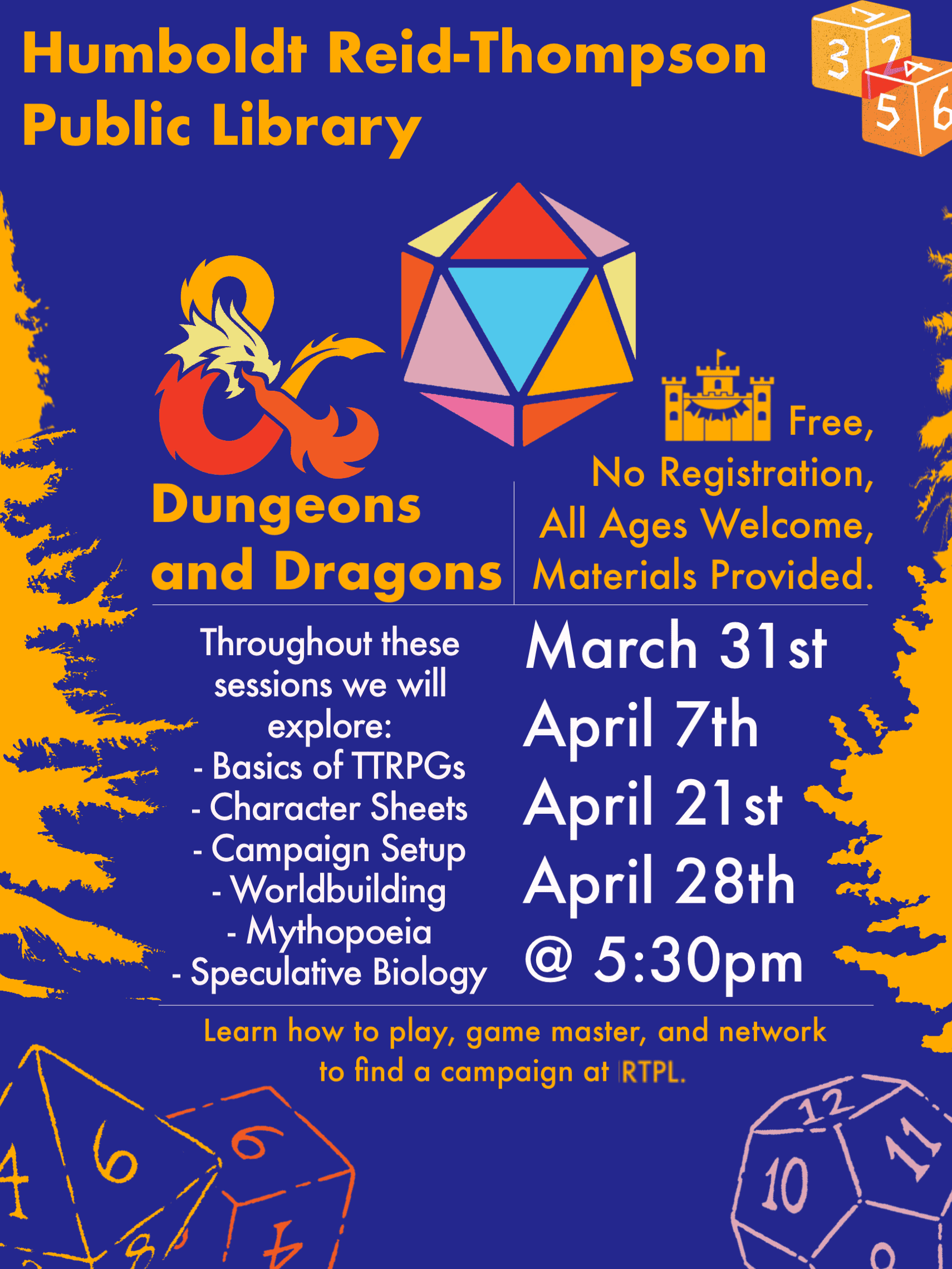 All ages and experience levels are invited to the library to learn all about playing in a D&D campaign and running their own! They had their first session on March 31st, but three more have been scheduled for April 7th, 21st and 28th, all at 5:30PM. You can come to one or all three.