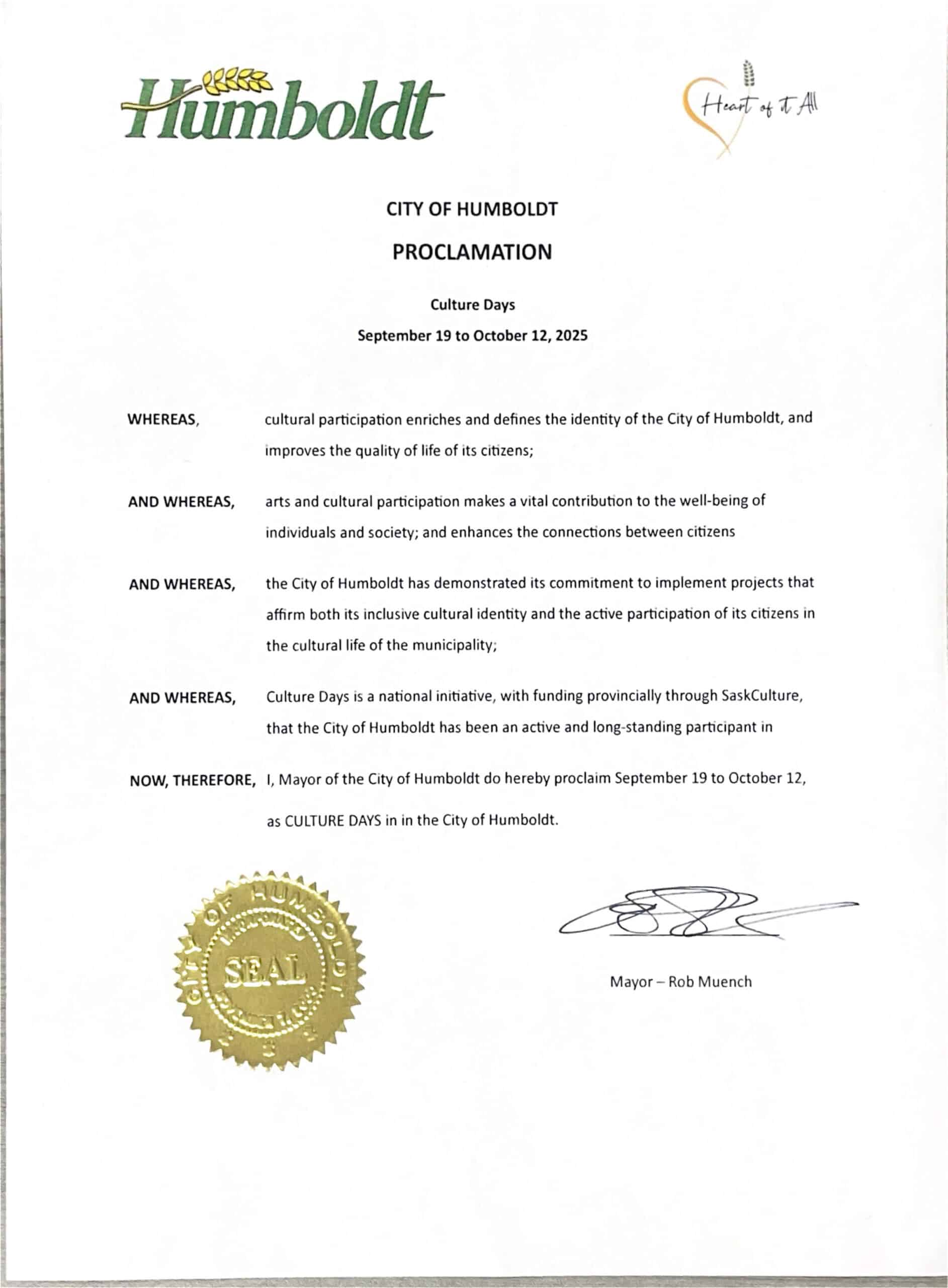 At the last Regular Meeting of Council, Mayor Muench proclaimed September 19 to October 12, 2025 as Culture Days in the City of Humboldt.