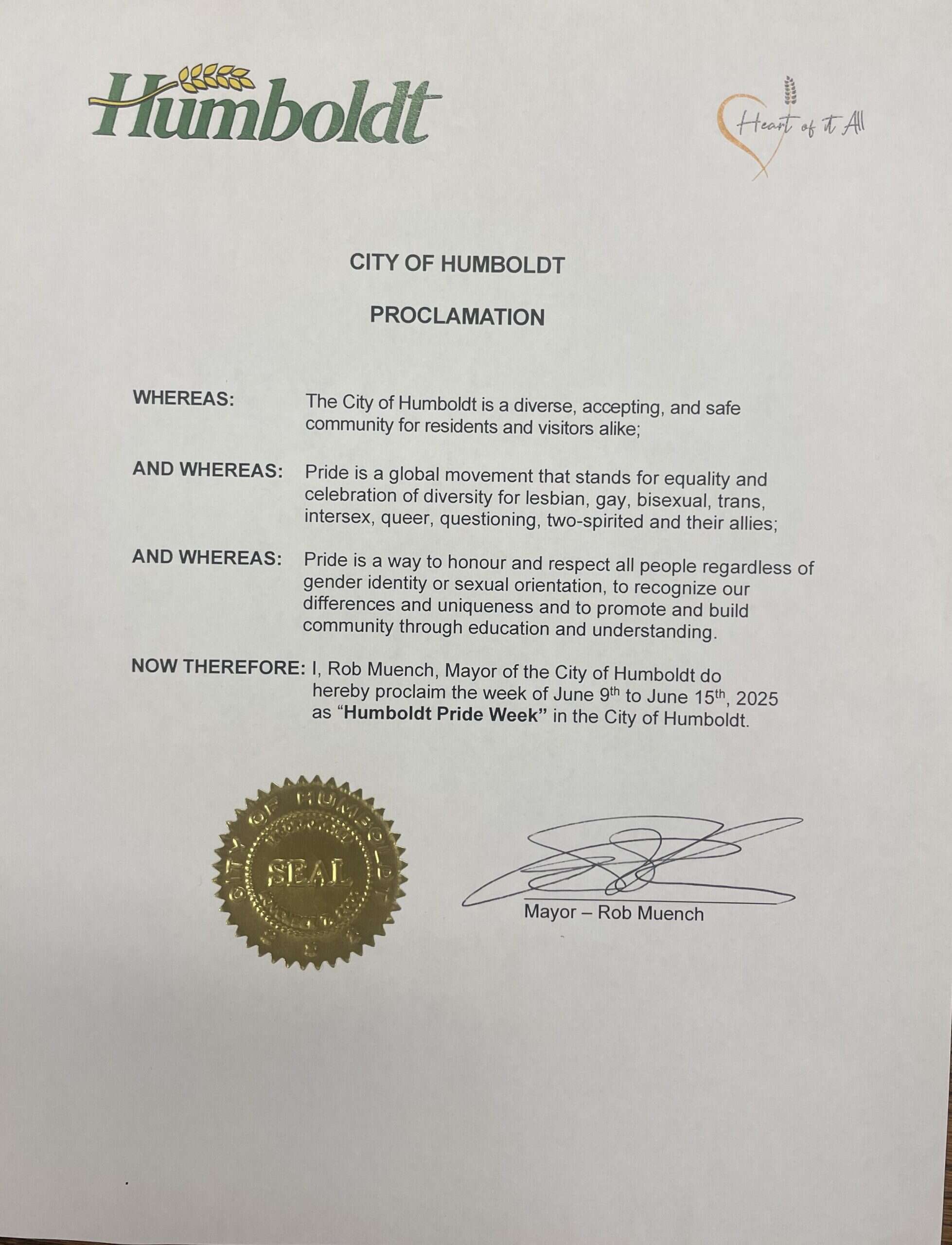 On Monday, May 26, 2025, at the Regular Meeting of Council, Mayor Muench proclaimed the week of June 9-15, 2025 as Humboldt Pride Week.