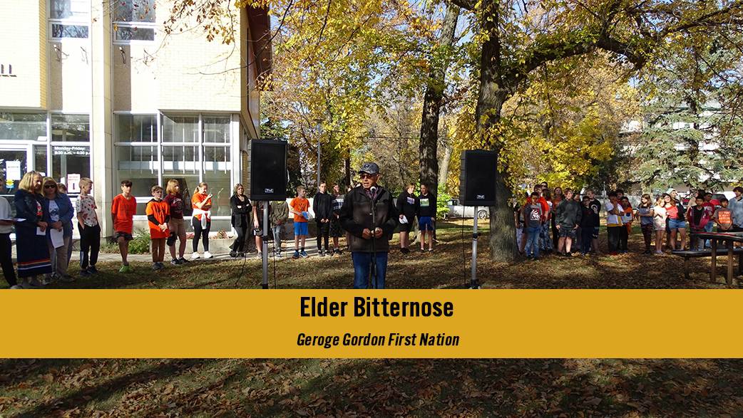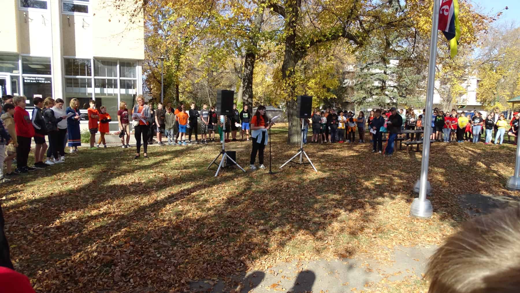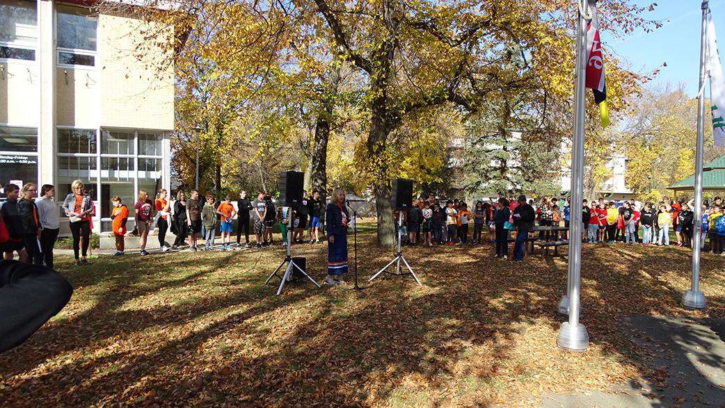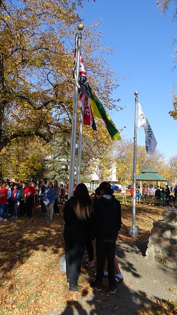 Earlier on Monday, September 25, 2023, a Treaty #6 Territory Flag was raised at City Hall by local youth with a gathering of approximately 120 young students from our 3 local schools as a symbol of observing Truth and Reconciliation. The Flag Raising Ceremony was opened with a prayer said by Elder Bitternose from the George Gordon First Nation, followed by the “Treaty 6 Song”, performed by a youth group.