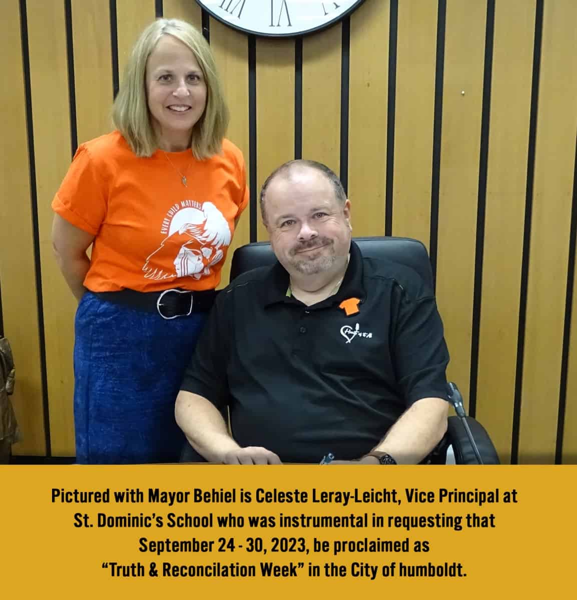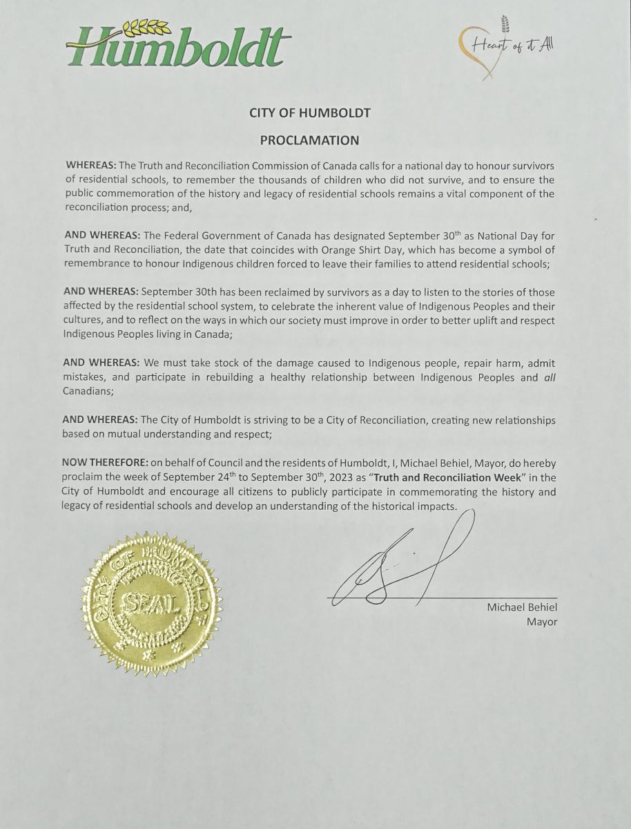 At the Regular Meeting of Council held on Monday, September 25, 2023, Mayor Behiel proclaimed the week of September 24 to September 30, 2023, as “Truth and Reconciliation Week” in the City of Humboldt and encourages all citizens to publicly participate in commemorating the history and legacy of residential schools and develop an understanding of the historical impacts.